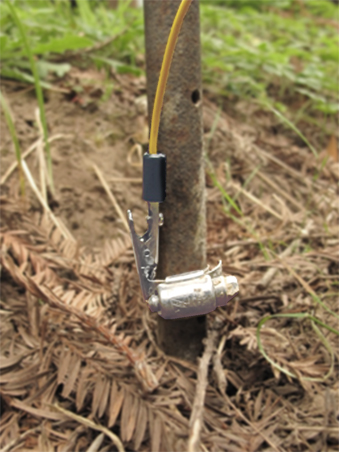Our antenna did not work on the pipe we used until we sanded the rust away on a small section under the clamp. What you can't see is that the dirt is damp. This is also important to make the ground work. If you have bone dry soil you may have to dump quite a bit of water on the dirt to make the soil more conductive. Clip the wire to the clamp.