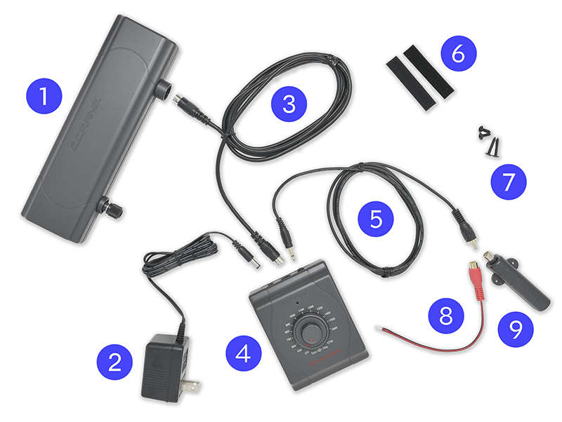 Patch cords, antenna, tuner, ferrite stick, mounting hardware and AC Adapter are included. Runs on included AC Adapter or 9V battery (not included).